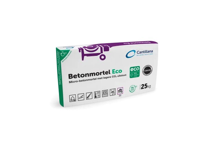 Cantillana Betonmortel Eco is een milieuvriendelijke, voorgemengde microbetonmortel met lagere CO2-uitstoot, ontwikkeld voor professioneel gebruik. Het product voldoet aan sterkteklasse C20/25 volgens NEN-EN 206 en is geschikt voor zowel gewapende als ongewapende betonconstructies, binnen en buiten.