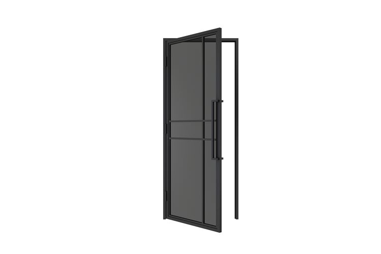 Deze scharnierdeur heeft een 32 mm dik stalen frame met zwarte poedercoating en 5 mm dik mat veiligheidsglas.